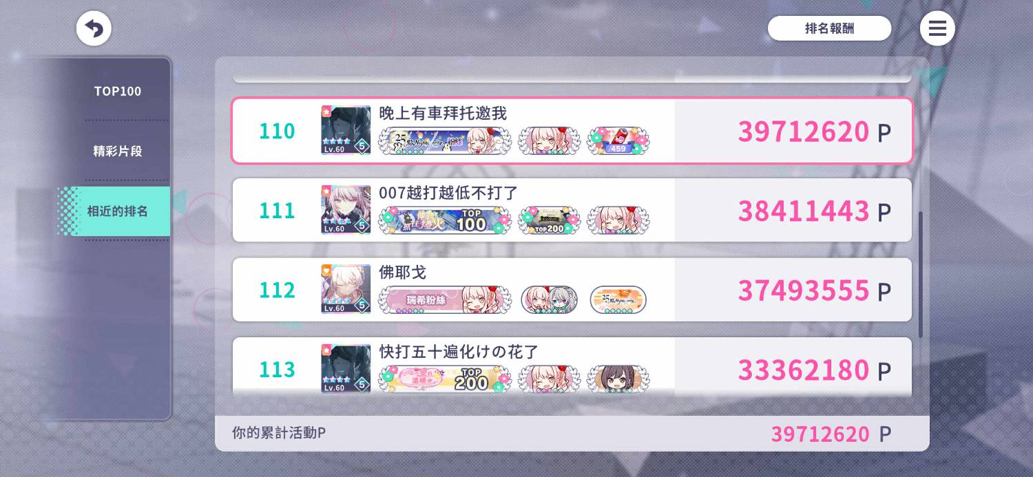 對 感謝文 一年前就決定好要衝瑞希五箱 但沒找好人真的超好笑 前面的日子可以說是全部野隊 如果配到一個叫雪滴的人一直選效率曲我很抱歉qwq 後來加了很多好友 也開始有人揪 排名也越來越穩定 除了那傻逼的段考卡死我時間 但最後也是取得了110的成績 很謝謝這7天之內有撞到我的人!!!! 效率曲的部分還是得抱歉 但這幾天真的非常開心!!! 雖然死亡作息好幾天 但真的很爽…. 謝謝大家!!!