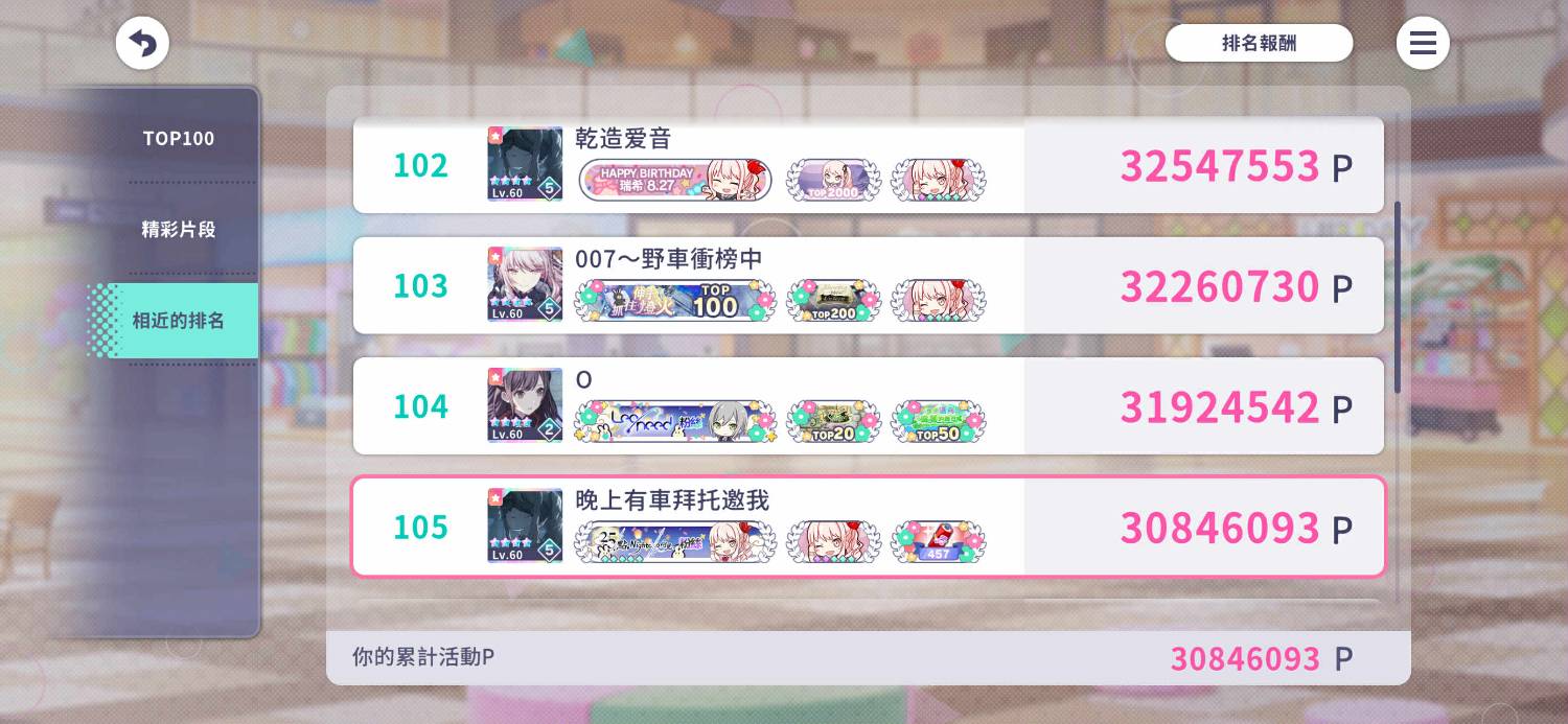 相信大家都(不)知道世界計畫每一期活動有一個榜單 雪滴在去年10月看到日服五箱瑞希(以下簡稱瑞五)的活動就決定要爆衝 當然 上天不會辜負雪滴的決心 非常剛好讓雪滴的段考跟瑞五重疊 起初雪滴想說 要不要就這樣算了 段考考炸的後果可是很可怕的 但在他一群好友的慫恿下 一人一句的「段考還有很多次 瑞五只有一次」下 他開啟了他的衝榜生活 第一天 3:00 第二天 3:30 當然 這些都是凌晨 雪滴過著非人的生活一路打一路打 而遇到了段考 那兩天幾乎沒怎麼玩 而段考完剩下3天的活動時間(包含當天) 段考完當天呢 他從回家(3:20一路打到了4:00) 一天打了800萬的活動P(活動排名就是看活動P) 隔天他去了他的朋友家 並約了一群人 那天只能說更是瘋狂 中午開始打到5:00 接下來打個Maimai 又繼續從11:00打到5:00(騎腳踏車[為甚麼騎腳踏車? 因為我們成功打mai打太晚沒有公車了qwq 然後還有三個人走了三個腳踏車站才借到車 然後親愛的黃先生 做到了騎一般youbike的速度超越了電輔車]去某人家路上時 雪滴在路上看到了一家85度C 突然想到他的朋友 也就是去他家玩的那個 生日在前幾天 於是雪滴就提議要不要買蛋糕來個大慶生 黃禹程:由於很晚的關係 我本來沒有要大慶祝了 本來隔天早上 我想說來個大慶祝 但突然想到要補習 我就被打斷了) 只能說這人真的為了榜單什麼都願意做 雪滴把他的60000石頭+400罐大體+200多罐小體全部打完我絕對不會說出來當天雪滴晚上騎完腳踏車衝去7-11花了1320買水晶繼續換體力打 而最後一天的結算前 他拼盡全力的打每一次的蝦(世界計畫效率曲 歌的時長最短 可以讓效益最大化) 最後取得了台服第110名的成績 爽死了